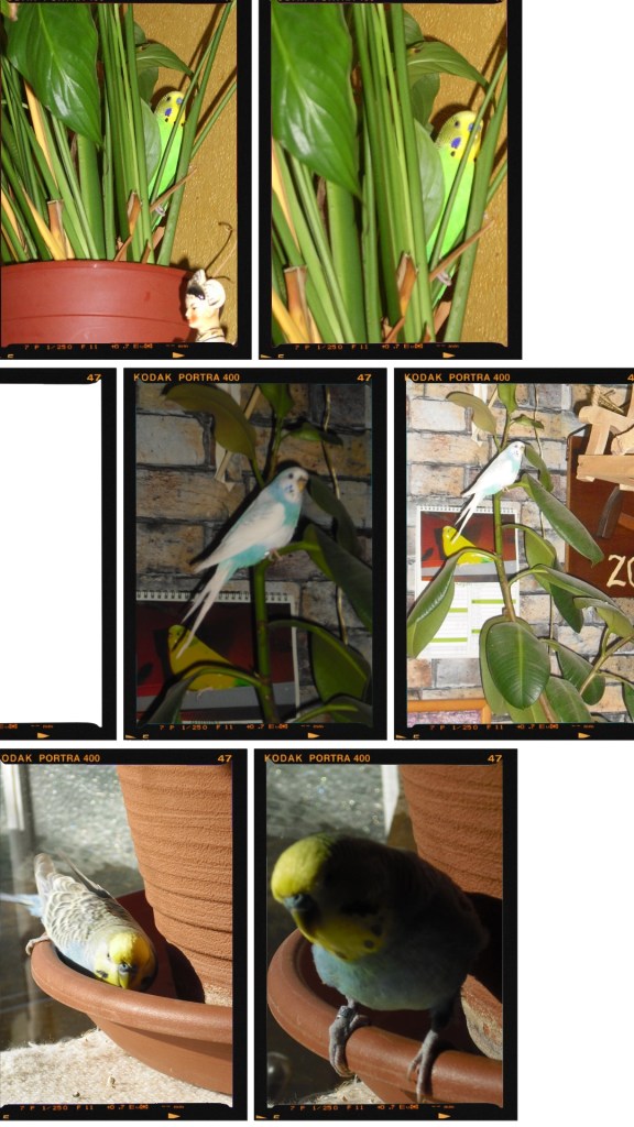 Hier habe ich ein paar Bilder von meinen Wellensittichen zusammengestellt, auf denen sie Unsinn anstellen